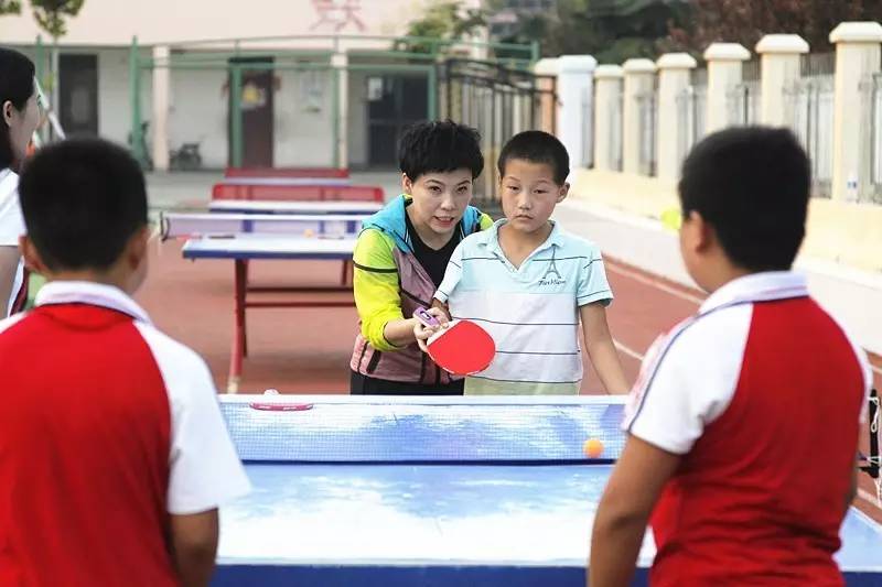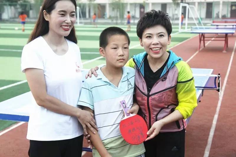 鄧亞萍與小隊長切磋球技 關注體育教育基礎發(fā)展