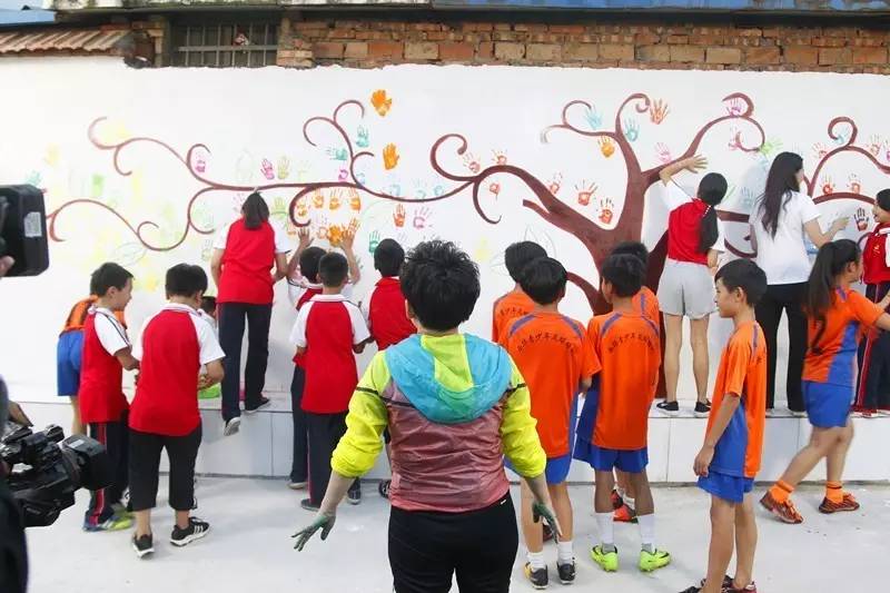 最后鄧亞萍和第一書記秦倩與老師同學們一起拿起畫筆,在希望小學的墻上畫出孫莊村的未來……