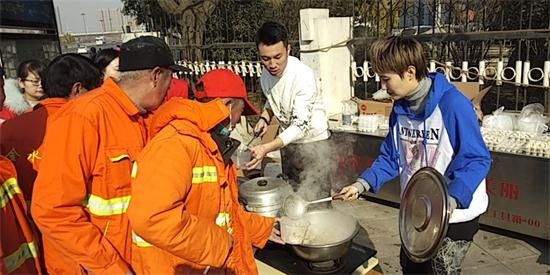 另一邊,在鄭州市花園路廣電南路交叉口,主持人劉雯和韓佳帶著十幾名義工早早的在路邊就開(kāi)始忙活了。他們要給附近50多名環(huán)衛(wèi)工人煮餃子。平時(shí),環(huán)衛(wèi)工們的午飯都很簡(jiǎn)單,甚至都是隨便對(duì)付的,這次,主持人和義工們特意選在離工人們中午休息比較近的地方,搭起了臨時(shí)的灶臺(tái),給工人們做上一頓熱騰騰的餃子。由于條件簡(jiǎn)陋,臨時(shí)灶臺(tái)上的火十分不穩(wěn)定,劉雯和韓佳脫下厚重的外套,擼起袖子親自生火,費(fèi)了好大勁終于把餃子下鍋了。吃上熱騰騰的餃子,環(huán)衛(wèi)工人們特別開(kāi)心。一位老大爺由衷的感嘆道:“好久沒(méi)吃過(guò)這么暖心的午飯了,謝謝你們。”