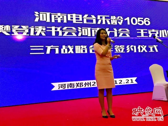 在河南電臺(tái)樂齡1056“說說心理話”主持人文聰?shù)闹鞒窒?,河南電臺(tái)信息廣播總監(jiān)助理沈建波、樊登讀書會(huì)河南分會(huì)會(huì)長程海濤、王克心理創(chuàng)始人王克共同簽約了三方合作協(xié)議。