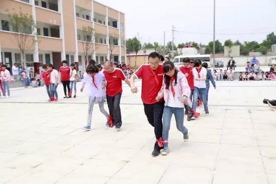 “加油,加油!”昨天,中牟黃店鎮(zhèn)中心小學(xué)的學(xué)生和志愿者們一起在廣播的音樂(lè)下玩著背靠背、兩人三足的游戲,大家玩得興高采烈。而這樣普通的游戲,這個(gè)學(xué)校的很多孩子是第一次玩兒。