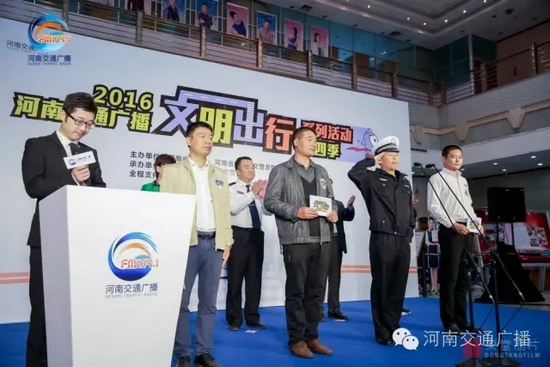 隨后,全國(guó)優(yōu)秀人民警察鄭州市交巡警支隊(duì)民警楊華民,帶領(lǐng)各位代表宣讀 2016河南交通廣播文明出行系列活動(dòng)倡議書,各行業(yè)代表包括公交車長(zhǎng)孫躍青、出租車代表王政偉、私家車代表暨上一屆文明出行終極大獎(jiǎng)獲得者楚新磊共同宣誓。