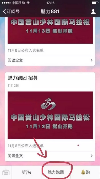 如果你想?yún)⒓颖敬伪荣惖?公里跑項(xiàng)目,請?jiān)邝攘?81微信公眾平臺點(diǎn)擊菜單“魅力跑團(tuán)”回復(fù)以下信息: