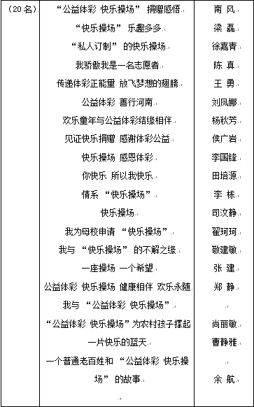經(jīng)過一個(gè)多月的征文和評選工作,由大河報(bào)與省體彩中心聯(lián)合舉辦的我與“公益體彩 快樂操場”有獎(jiǎng)?wù)魑幕顒?dòng)圓滿結(jié)束,本次活動(dòng)共評出一等獎(jiǎng)1名、二等獎(jiǎng)5名、三等獎(jiǎng)10名、優(yōu)秀獎(jiǎng)20名以及9個(gè)集體獎(jiǎng)項(xiàng),隨后將舉行頒獎(jiǎng)儀式對獲獎(jiǎng)?wù)哌M(jìn)行表彰。