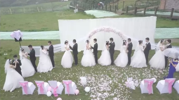 青山環(huán)抱的草坪中間,鮮花點綴,西服、婚紗、司儀……一樣不少,成對的新郎新娘溫情相擁,環(huán)繞的云霧和綿綿細(xì)雨,更為這場婚禮營造了浪漫的氣氛。據(jù)網(wǎng)上文章稱,婚禮現(xiàn)場的新郎、新娘們,是來自成都一高校工程造價管理專業(yè)大四一畢業(yè)班的15對情侶。