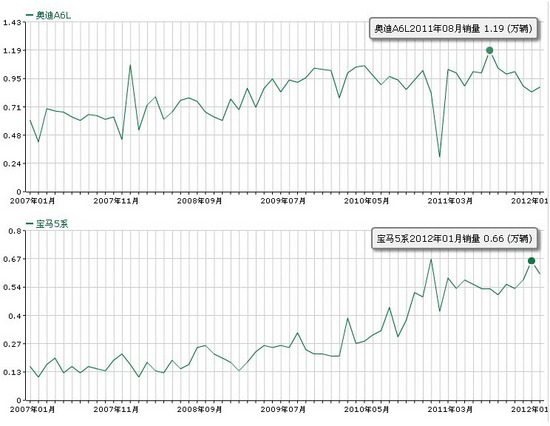 【寶馬5系和奧迪A6L近幾年來的銷量走勢對比】