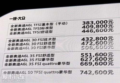 3月28日,全新一代奧迪A6L正式國內(nèi)上市,新奧迪A6L采用了全新的家族式外觀設(shè)計,車身尺寸進一步加長,并且配置上全面升級。動力上,新A6L將搭載2.0T、2.5L、2.8L、以及3.0TFSI,并且將采用全新的尾部標(biāo)識。新一代奧迪A6L共推出10款車型,售價區(qū)間為38.3-74.26萬元,具體車型售價如下表所示: