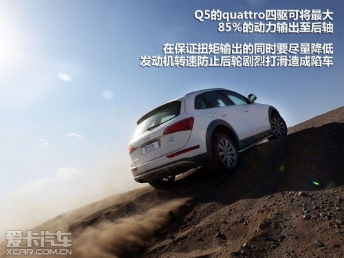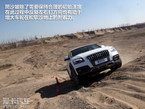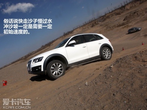 沙坡前半部分的坡度相對要緩一些,而奧迪Q5通過這里的過程自然也是毫不費(fèi)力。那么在接下來更陡的后半部分當(dāng)中,坡度的增大導(dǎo)致了車速急劇下降,此時松軟的沙子也就成為了車輛繼續(xù)攀爬的絆腳石,恰恰也就在此刻,檢驗quattro四驅(qū)系統(tǒng)真正能耐的時候隨之而來。