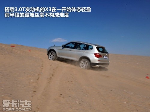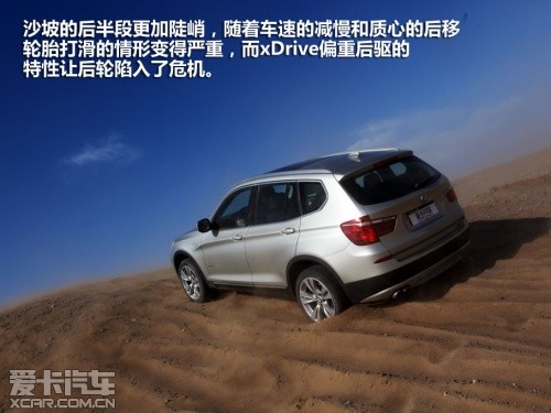 或許是奧迪Q5完成測試的過程比較順利,我們對接下來即將登場的寶馬X3也普遍比較看好,這或許就是思維慣性帶來的固定套路吧。然而在實地測試過程中,這臺X3攀爬沙丘的過程卻沒有表現(xiàn)出它在公路上所煥發(fā)出的霸氣。400牛·米的最大扭矩在城市道路中,甚至在高速公路上都是無與倫比的,但移步至眼前狂風(fēng)大作的沙丘,這400?!っ椎呐ぞ貏t像是心有余而力不足的悲情英雄。