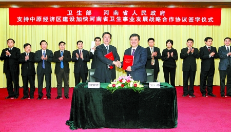 河南日?qǐng)?bào)訊 (記者屈 芳)河南衛(wèi)生事業(yè)迎來(lái)加快發(fā)展的新機(jī)遇。3月21日下午,衛(wèi)生部與河南省人民政府關(guān)于支持中原經(jīng)濟(jì)區(qū)建設(shè)加快河南省衛(wèi)生事業(yè)發(fā)展戰(zhàn)略合作協(xié)議簽字儀式在北京舉行,衛(wèi)生部部長(zhǎng)陳竺,省委副書(shū)記、省長(zhǎng)郭庚茂在簽字儀式上講話并代表雙方在合作協(xié)議上簽字。