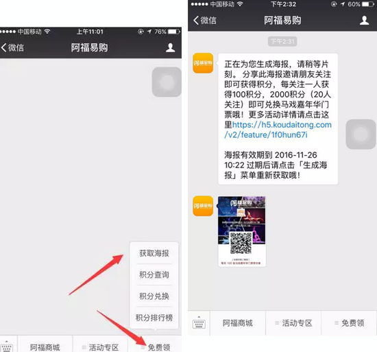 首先點擊右小角的免費領(lǐng),然后點擊分享海報,分享給好友關(guān)注阿福易購的微信公號就可獲得積分。一個好友一百個積分,20個好友就可獲得2千個積分就能兌換馬戲門票。