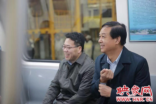 “滎陽(yáng)造”首列地鐵列車(chē)正式下線后,滎陽(yáng)市委書(shū)記宋書(shū)杰(右一)坐上列車(chē)參觀。