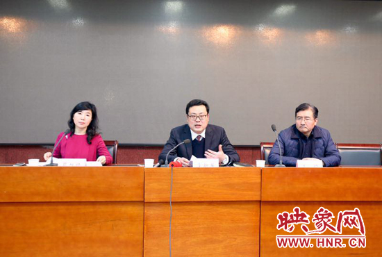 鄭州市上街區(qū)區(qū)委副書(shū)記李新軍(中)向記者介紹鄭州通航試驗(yàn)區(qū)情況。映象網(wǎng)記者 段晉哲/攝