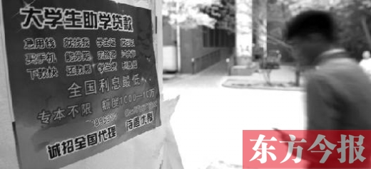 “親愛的同學(xué)們,還在為每個(gè)月超支的生活費(fèi)擔(dān)心嗎?還在為沒錢買‘愛瘋’著急嗎?還在為沒錢沒法‘說(shuō)走就走’失落嗎?別發(fā)愁,看這里,無(wú)抵押貸款,金額500到5000元,六個(gè)月內(nèi)還清,絕無(wú)壓力?!?/p>