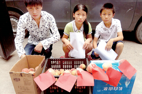 “媽媽兒子想你”6張紅紙貼在桃子上