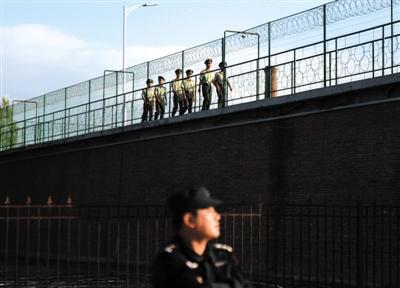 昨日,武警戰(zhàn)士在延壽縣看守所巡邏執(zhí)勤。新華社記者 王凱 攝