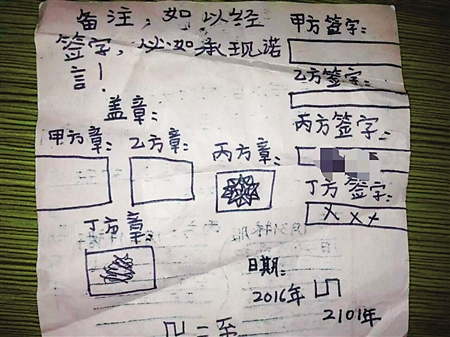 記者看到,這份合同規(guī)定由甲乙丙丁四方簽署,分別代表父、母、小雪和未來的弟弟或妹妹。條款規(guī)定大致如下:1。生了二胎以后(無論男女、龍鳳、雙胞胎),甲方乙方不可偏心丁方,要以從前那種態(tài)度對待丙方。2。不可以丁方太小或經(jīng)濟不寬裕為由,克扣丙丁雙方的吃穿用度。該條款下具體擬定了衣服、喝奶和飲食要求,如丁方每月3件衣服,每天必須喝奶,哭了爸媽必須安撫;自己作為丙方,每月2件裙子,飯食飲水不可少一件,自己可以照顧弟妹,不可偏心。以上條款經(jīng)過簽字,必須兌現(xiàn)承諾。合同期限為2016年~2101年。甲乙丙丁四方分別留有簽字、蓋章的空格,其中丙方的簽字和蓋章(圖畫)已簽署完畢。