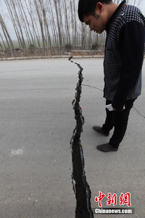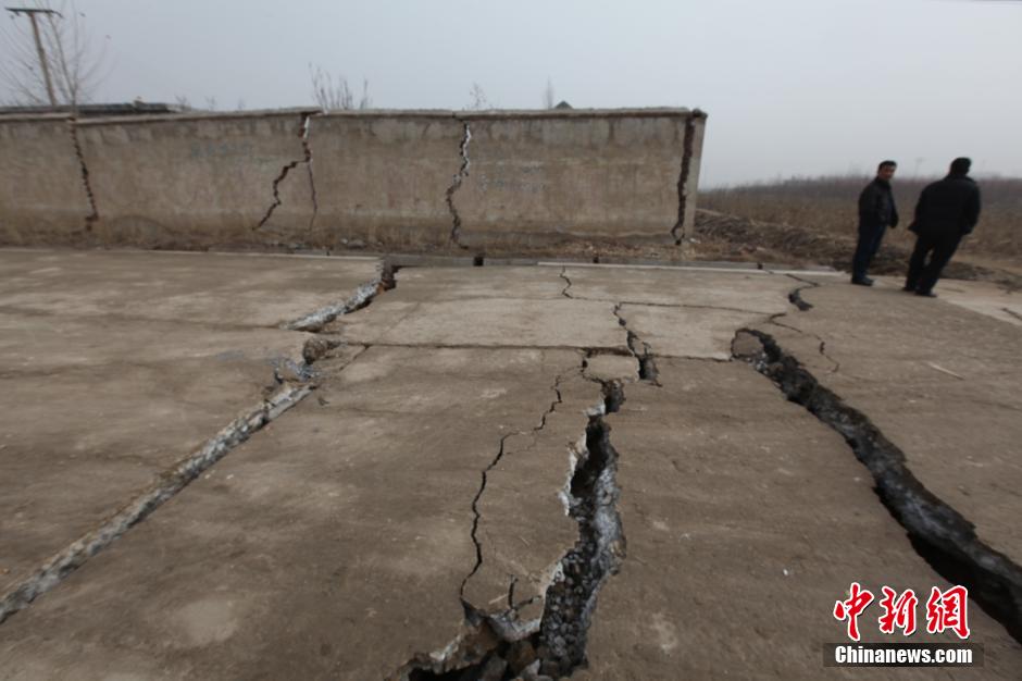 12月25日,山東平邑,位于平邑縣保太鎮(zhèn)的玉榮商貿(mào)有限公司石膏礦發(fā)生坍塌事故。圖為因塌陷開裂的道路。視覺中國(guó)供圖