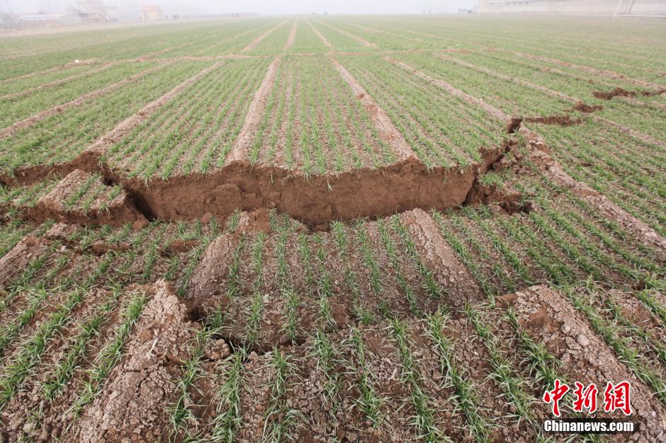 12月25日,山東平邑,位于平邑縣保太鎮(zhèn)的玉榮商貿(mào)有限公司石膏礦發(fā)生坍塌事故。圖為礦區(qū)塌陷的麥田。視覺中國(guó)供圖