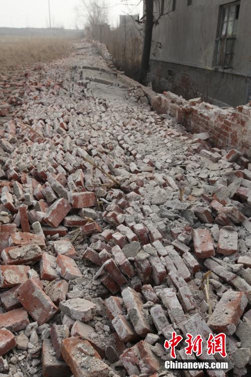 12月25日,山東平邑,位于平邑縣保太鎮(zhèn)的玉榮商貿(mào)有限公司石膏礦發(fā)生坍塌事故。圖為倒塌的院墻。視覺中國(guó)供圖