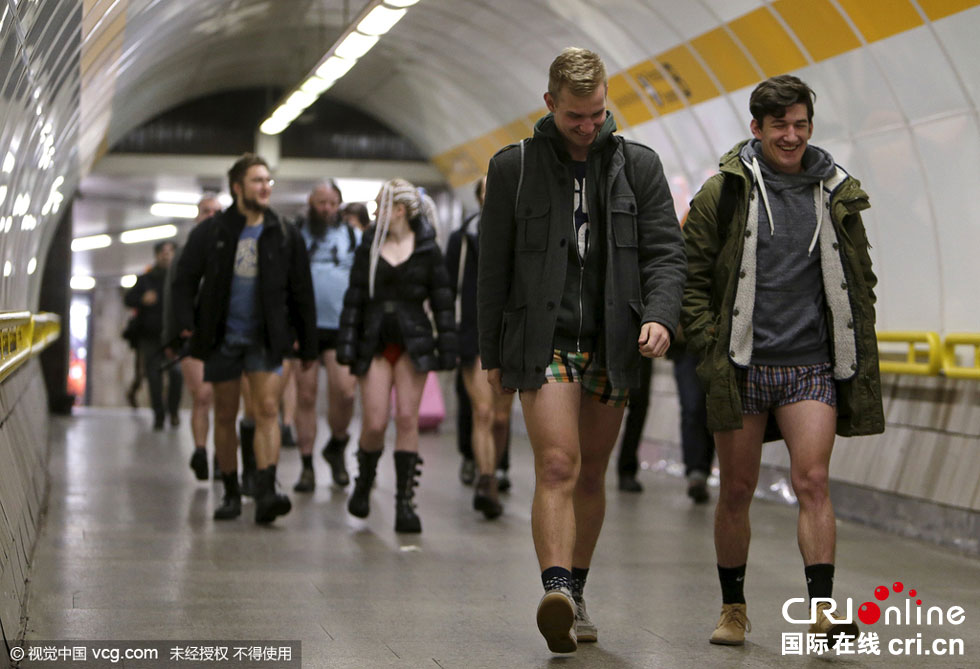 當(dāng)?shù)貢r間2016年1月10日,捷克布拉格,“地鐵無褲日”當(dāng)天,乘客穿短褲乘車。圖片來源:視覺中國