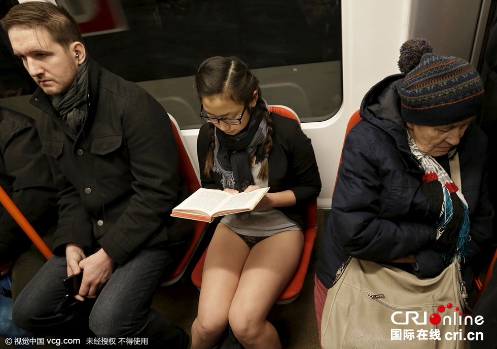 當(dāng)?shù)貢r間2016年1月10日,奧地利維也納,“地鐵無褲日”當(dāng)天,乘客穿短褲乘車。圖片來源:視覺中國