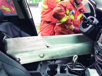 一輛越野車撞上互通分流處的護欄鋼板,猛烈的撞擊使一根護欄鋼板戳穿車頭,插在駕駛室里的女司機王某的左大腿及腹部,令其無法動彈,王某忍痛撥打電話報警求救。