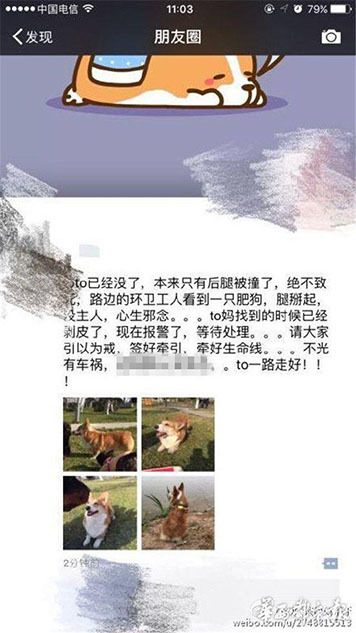 據(jù)主人李女士講述,“早上8點20分左右,我媽媽帶狗出去散步,它跟著別的狗跑丟了。我們找了很久。”李女士說,小狗跑丟后,在成都一愛寵微信群里,有群友稱在三環(huán)路上看到過它,“說是它橫穿三環(huán)路,把后腿撞到了,它就沿著三環(huán)路跑了?!眻D為李女士在朋友圈發(fā)布的尋狗信息。