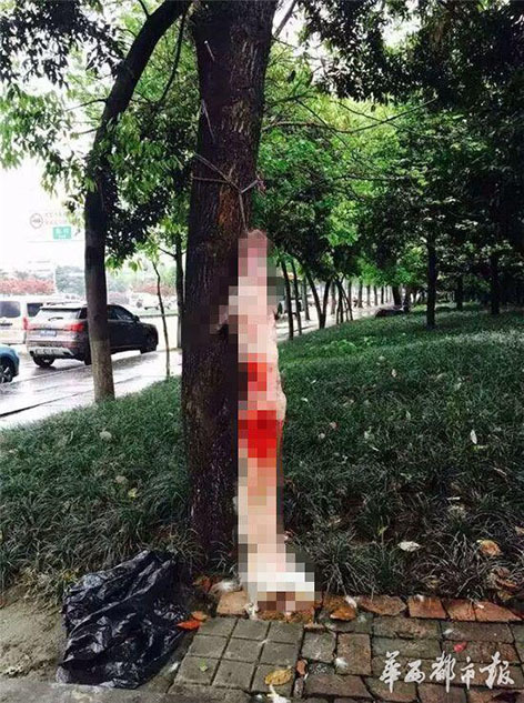 李女士一家順著三環(huán)路輔道一路尋找,最終在三環(huán)路的輔道上找到了TOTO,然而此時它已經(jīng)是一具尸體。“被掛在樹上,已經(jīng)被剝了皮。后腿確實有被車撞的痕跡?!闭f到這里,李小姐在電話里哭了起來,“我們到現(xiàn)場的時候,有一名環(huán)衛(wèi)工摸樣的人還正在剝皮!”