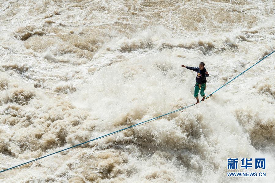 4月26日,張亮在扁帶上行走。當(dāng)日,在云南香格里拉的長(zhǎng)江天險(xiǎn)虎跳峽上,“中國(guó)扁帶第一人”張亮利用寬度只有2.5厘米的扁帶,在距離江面16米的高度上成功行走60米,耗時(shí)5分58秒抵達(dá)虎跳峽香格里拉一側(cè)的終點(diǎn)完成挑戰(zhàn)。