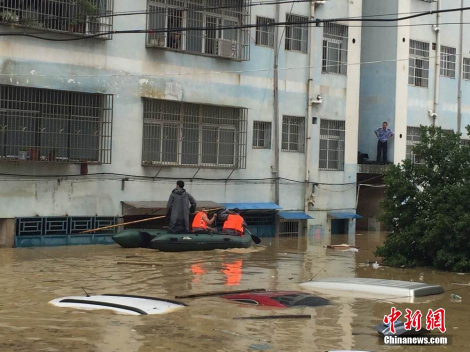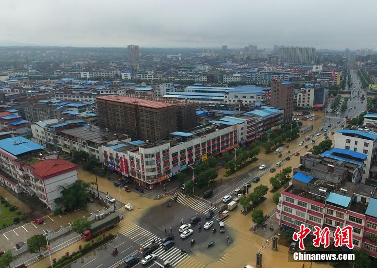 5月5日,地處湘南的永州市道縣遭遇暴風雨襲擊,縣城內(nèi)多處低洼路段被水淹沒。當?shù)胤姥床块T正嚴密監(jiān)控雨情、水情,確保安全度汛。 中新社發(fā) 何紅福 攝