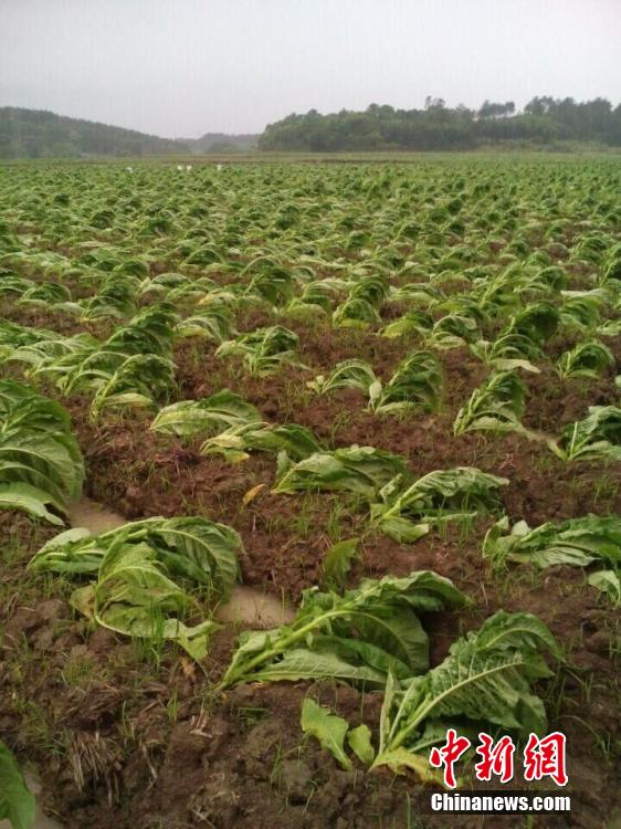 5月4日至5日,地處湘南的永州市道縣遭遇龍卷風和暴風雨襲擊,部分鄉(xiāng)鎮(zhèn)的樹木被大風攔腰折斷或連根拔起,46個行政村電力中斷,當季農(nóng)作物特別是烤煙大面積受災(zāi)。目前,該縣已迅速組織2000余名各級干部,深入災(zāi)區(qū)組織搶險救災(zāi)。圖為龍卷風過后烤煙大面積倒伏。 道縣宣傳部 供圖