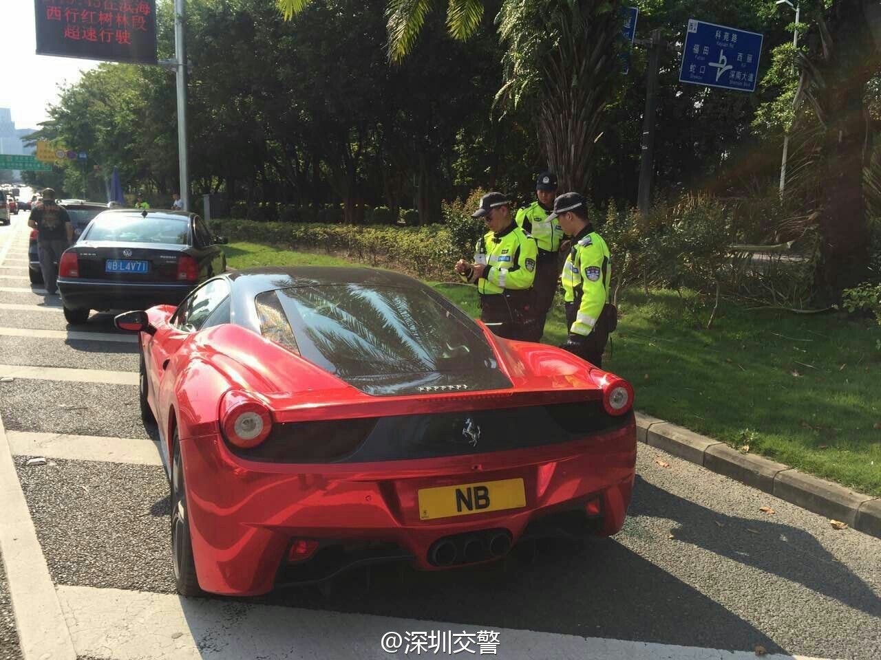 深圳交警5月7日17:16發(fā)布了一條微博:“當(dāng)鐵騎遇到他……”,同時配上四張圖片:只見一輛掛著“NB”車牌的紅色跑車被交警鐵騎攔下,最后被帶走。