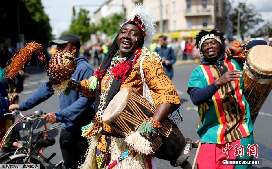 當(dāng)?shù)貢r(shí)間5月15日,德國(guó)柏林,當(dāng)?shù)孛癖娚碇厣椩诎亓治幕駳g節(jié)上參加游行。當(dāng)日,柏林舉辦文化狂歡節(jié)大游行,數(shù)千名來(lái)自世界各地的狂歡者加入。