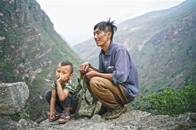 圖為5月14日,在三名家長(zhǎng)的保護(hù)下,15個(gè)孩子從勒爾小學(xué)出發(fā),走崖壁,爬藤梯,踏上回家的路。4月27日,阿土勒爾村的一個(gè)村民摔下了懸崖,村子里的大人對(duì)在山下讀書的孩子更加擔(dān)心起來(lái)。阿土勒爾村有15個(gè)6至15歲的孩子在山腳下的勒爾小學(xué)上學(xué),平時(shí)住校,每月月中和月底的周末才回家。每次上下山,家長(zhǎng)們都會(huì)輪流接送。5月14日是家長(zhǎng)接孩子的日子,清晨6點(diǎn)多,30多歲的陳古吉帶著背包繩和另外兩個(gè)家長(zhǎng)一起下山接孩子。村里身手敏捷的年輕人,下山通常需要1小時(shí),上山大約90分鐘,對(duì)于外來(lái)的人,通常是這個(gè)時(shí)間的兩倍。