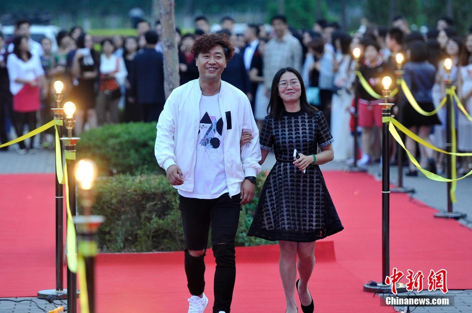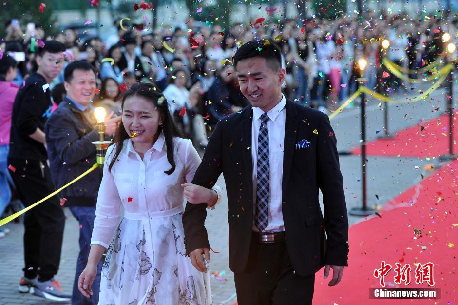 6月3日晚,山西大學(xué)美術(shù)學(xué)院畢業(yè)典禮,大學(xué)畢業(yè)生通過紅地毯走進會場,學(xué)弟學(xué)妹們夾道歡迎。當(dāng)畢業(yè)生情侶一起走秀時,引起學(xué)弟學(xué)妹們一陣尖叫。韋亮 攝