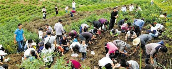 昨天,記者驅(qū)車(chē)來(lái)到了這個(gè)幾乎是磐安縣最東面的偏遠(yuǎn)鄉(xiāng)鎮(zhèn)胡宅,事實(shí)上,后張村就處于磐安和新昌交界的地方。中午時(shí)候,這個(gè)人口上千的村落幾乎已經(jīng)被各種各樣的車(chē)子停滿(mǎn)了,有奔馳越野車(chē),也有面包車(chē)和電瓶車(chē),有浙G、浙D、浙A等省內(nèi)牌照的,也有皖N的。這里的山頭傳說(shuō)是死火山形成,所以土壤肥沃,幾乎整塊都被犁出來(lái),種上莊稼,最多的是茶樹(shù)。一眼望去,尋寶的人員估計(jì)有六七百人,有人在挖,也有人是在圍觀(guān)。村民說(shuō),來(lái)來(lái)回回,當(dāng)天起碼涌進(jìn)來(lái)上千人在尋寶。