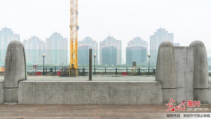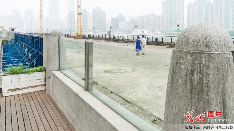 當(dāng)日中午,走訪南外灘老碼頭,見到這一長(zhǎng)達(dá)數(shù)十米,由鋼筋混凝土墻體和通透式玻璃組合而成的"抗洪神器",其中雙層玻璃防汛墻的厚度達(dá)到18毫米,既滿足防汛擋水需要,同時(shí)方便游客坐在岸堤邊欣賞老碼頭和江岸景色。(王岡攝/光明圖片)