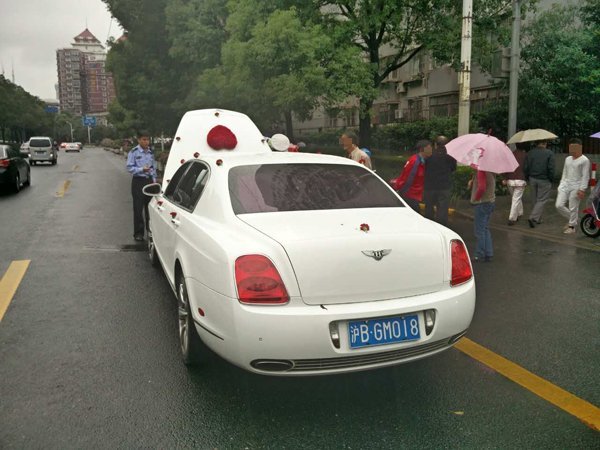 下午2點(diǎn)45分許,上海交警總隊(duì)機(jī)動(dòng)支隊(duì)巡邏時(shí),在周家嘴路近大連路處發(fā)現(xiàn)一路婚車車隊(duì),共計(jì)5輛車,其中領(lǐng)頭的是懸掛“滬BGM018”牌號的白色賓利歐陸跑車。后經(jīng)查實(shí),此車為套牌車。