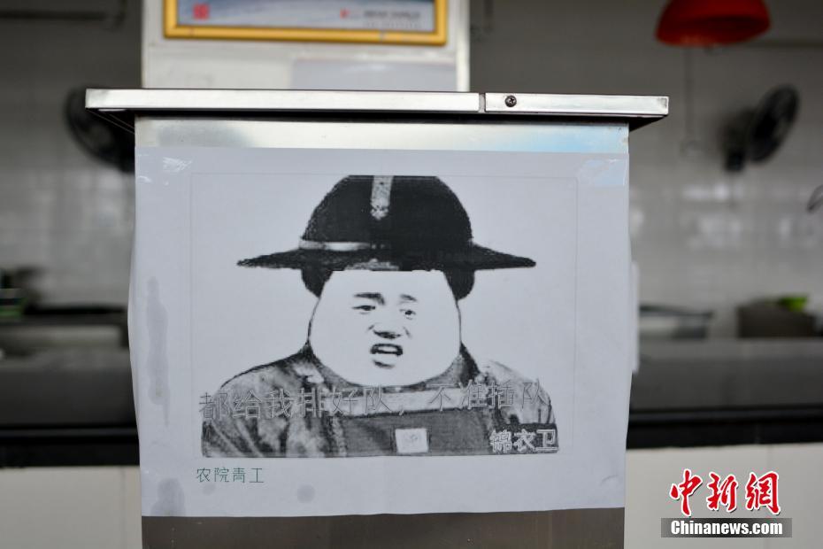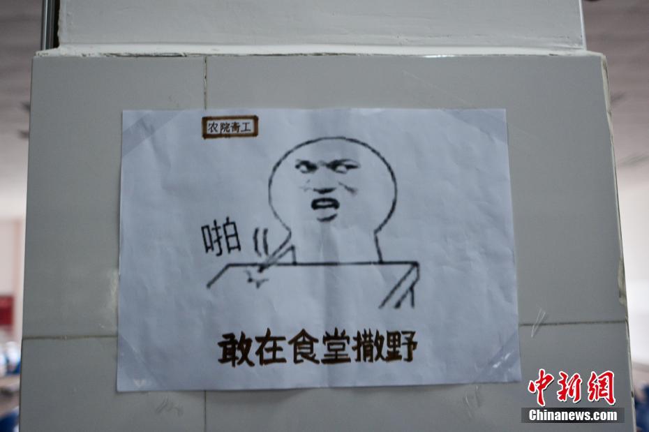 近日,四川農(nóng)業(yè)大學(xué)食堂的“魔性”表情包告示牌在網(wǎng)絡(luò)走紅。告示牌上除了夸張的“魔性”圖案,還配有“吃完盤中餐,不做剩男剩女”、“敢在食堂撒野”、“默默吃著飯”等文字。四川農(nóng)業(yè)大學(xué)工作人員介紹,這組魔性表情包告示牌由該校農(nóng)學(xué)院同學(xué)們自發(fā)創(chuàng)作張貼,目的是為了讓同學(xué)們不要浪費糧食,注意排隊。 四川農(nóng)業(yè)大學(xué)供