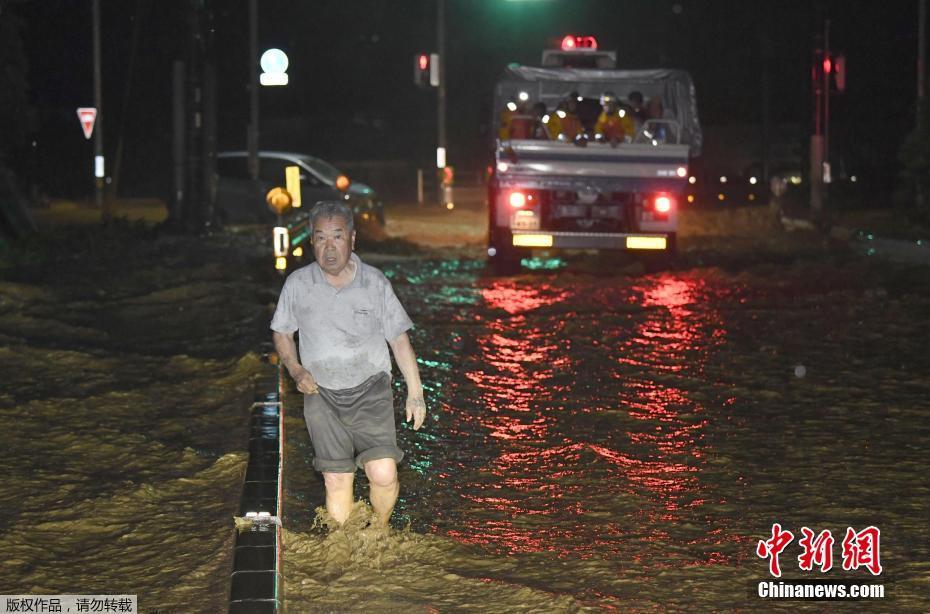 臺(tái)風(fēng)導(dǎo)致日本最少47班國內(nèi)線航班取消,3000名旅客受影響,3人因風(fēng)暴引起的事故受傷。圖為福岡縣朝倉地區(qū)的居民在洪水中跋涉。