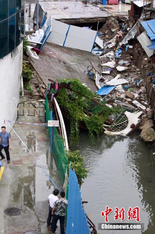 7月18日,深圳普降大暴雨局部特大暴雨,致部分路段嚴(yán)重積水、山體滑坡道路中斷、交通擁堵等險(xiǎn)情。深圳鹽田區(qū)盤(pán)山公路恩上路段出現(xiàn)滑坡,無(wú)人員、車輛被困;深鹽二通道下沙頭角出口匝道中間因山水傾瀉,道路中斷,交警已經(jīng)實(shí)施了交通管制。當(dāng)?shù)貧庀蟛块T先后發(fā)布了雷電、暴雨黃色、暴雨橙色和暴雨紅色分區(qū)預(yù)警信號(hào)。圖為深圳寶安區(qū)西鄉(xiāng)永安商業(yè)城門前區(qū)域坍塌,長(zhǎng)約15米、寬約6米的塌陷。中新社記者 鐘新 攝