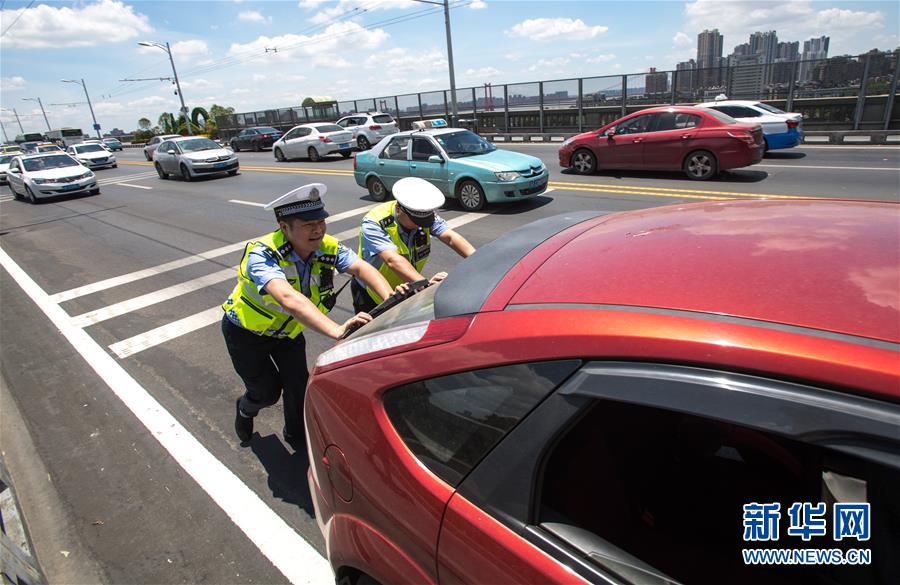 7月19日,武漢大橋大隊交警劉升(左)與同事一起將拋錨車輛推離橋面。