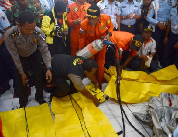 當(dāng)?shù)貢r間2014年12月30日,印尼龐卡蘭布翁,印尼搜救部隊準備尸袋前往飛機失事地點打撈殘骸和遺體。