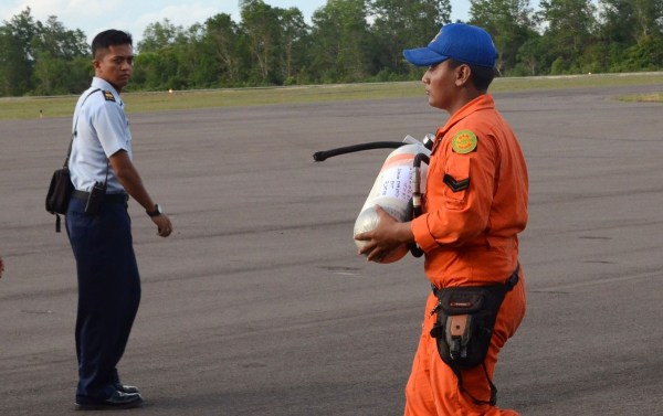 當(dāng)?shù)貢r間2014年12月30日,印尼龐卡蘭布翁,雅加達空軍基地指揮官Marshal Dwi Putranto正在展示從現(xiàn)場打撈上來的一個緊急滑梯和乘客的行李箱。