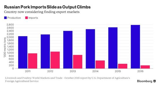 2014年烏克蘭危機爆發(fā)后,為回應(yīng)西方國家的制裁,俄羅斯宣布“全面禁止”從歐盟、美國及其它西方國家進口豬肉等食物。與此同時,總統(tǒng)普京表示俄羅斯有潛力成為全世界食品生產(chǎn)的領(lǐng)軍者,并預(yù)計到2020年實現(xiàn)農(nóng)業(yè)自足。