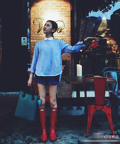 照片中,陳意涵穿著超短褲和紅色雨鞋,站在屋檐下躲雨,一雙又白又細(xì)的大長腿,也成為了整張照片的亮點(diǎn)。