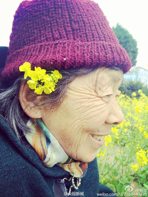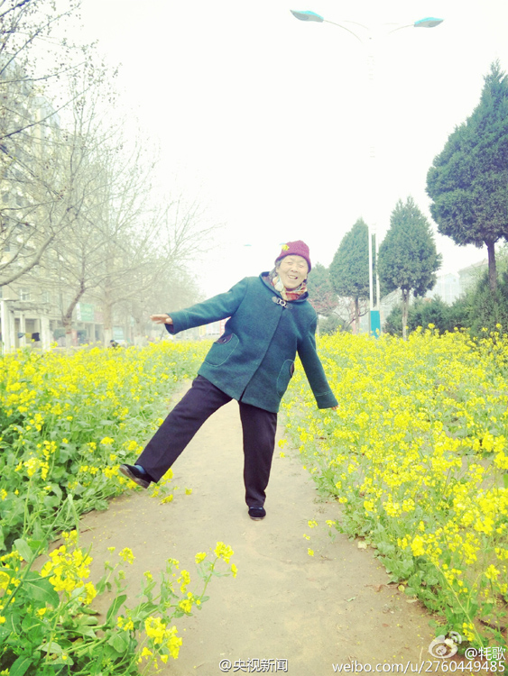 4月4日,網(wǎng)友“牦歌”在微博上曬出了一組照片,題為“你的皺紋比歲月更美”,照片的主角是“我奶奶”。一片金黃的油菜花田中,一位身穿灰色大衣,頭戴棗紅色線帽的老人或轉(zhuǎn)身回眸淺笑,或低頭輕聞花香,還45°角仰望天空,甚至單腳站立擺出“大”字狀。最可愛的要數(shù)老人擷取了一支油菜花插在耳邊,如果不是面龐已布滿皺紋,老人就如同一個嬌羞的小姑娘。圖為奶奶45°角仰望天空。