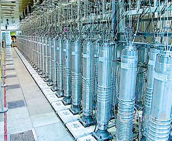 伊朗電視臺(tái)顯示了納坦茲核設(shè)施內(nèi)的鈾濃縮設(shè)備(2012年2月15日拍攝)。