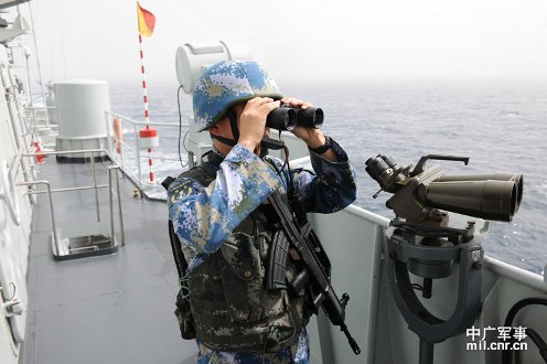 3月21日,海軍第十一護(hù)航編隊(duì)首次獨(dú)立執(zhí)行護(hù)航任務(wù)。“青島”艦警戒哨正在觀察海面情況。米晉國攝影